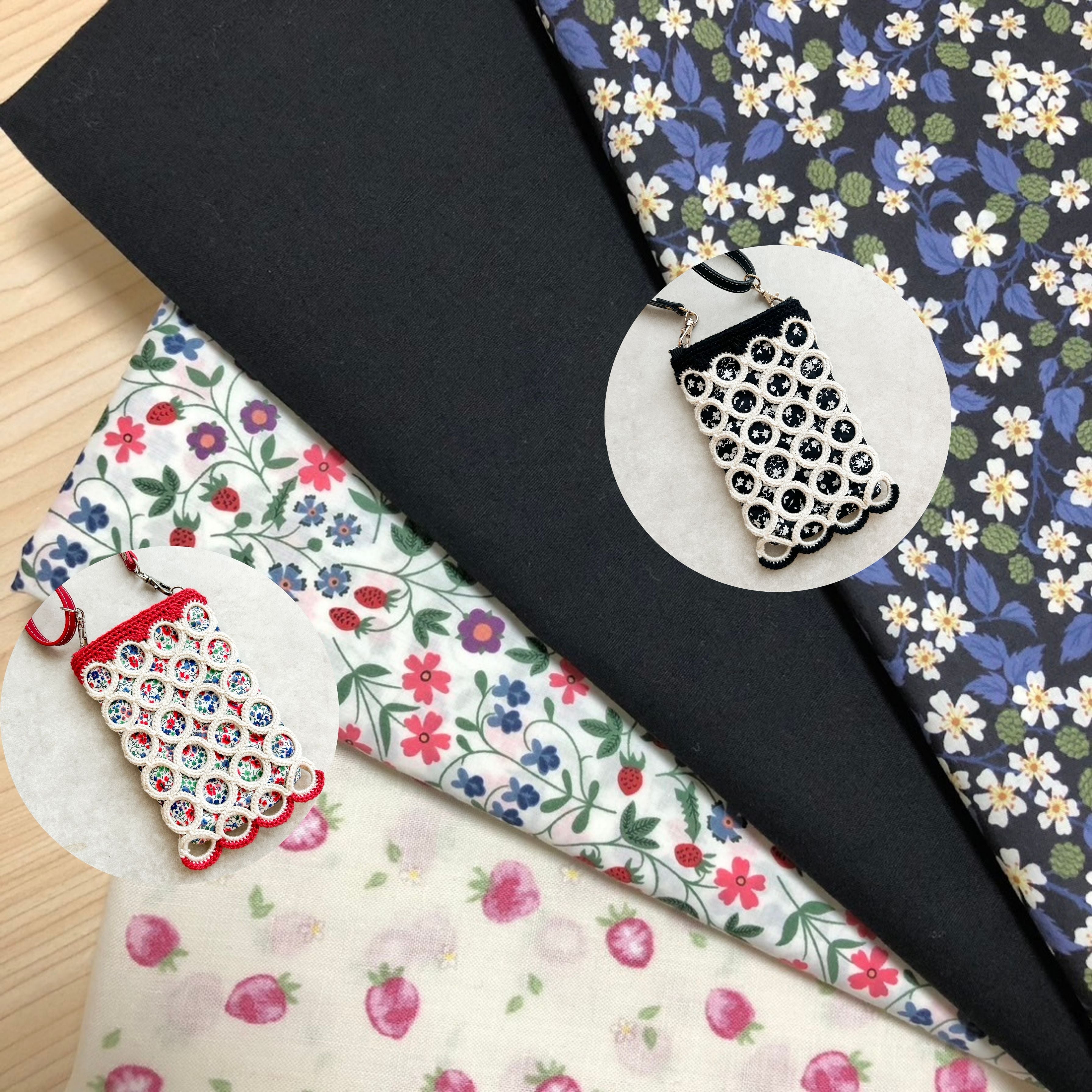 リバティー生地を縫って、編んだリングの袋に入れて内袋にします。