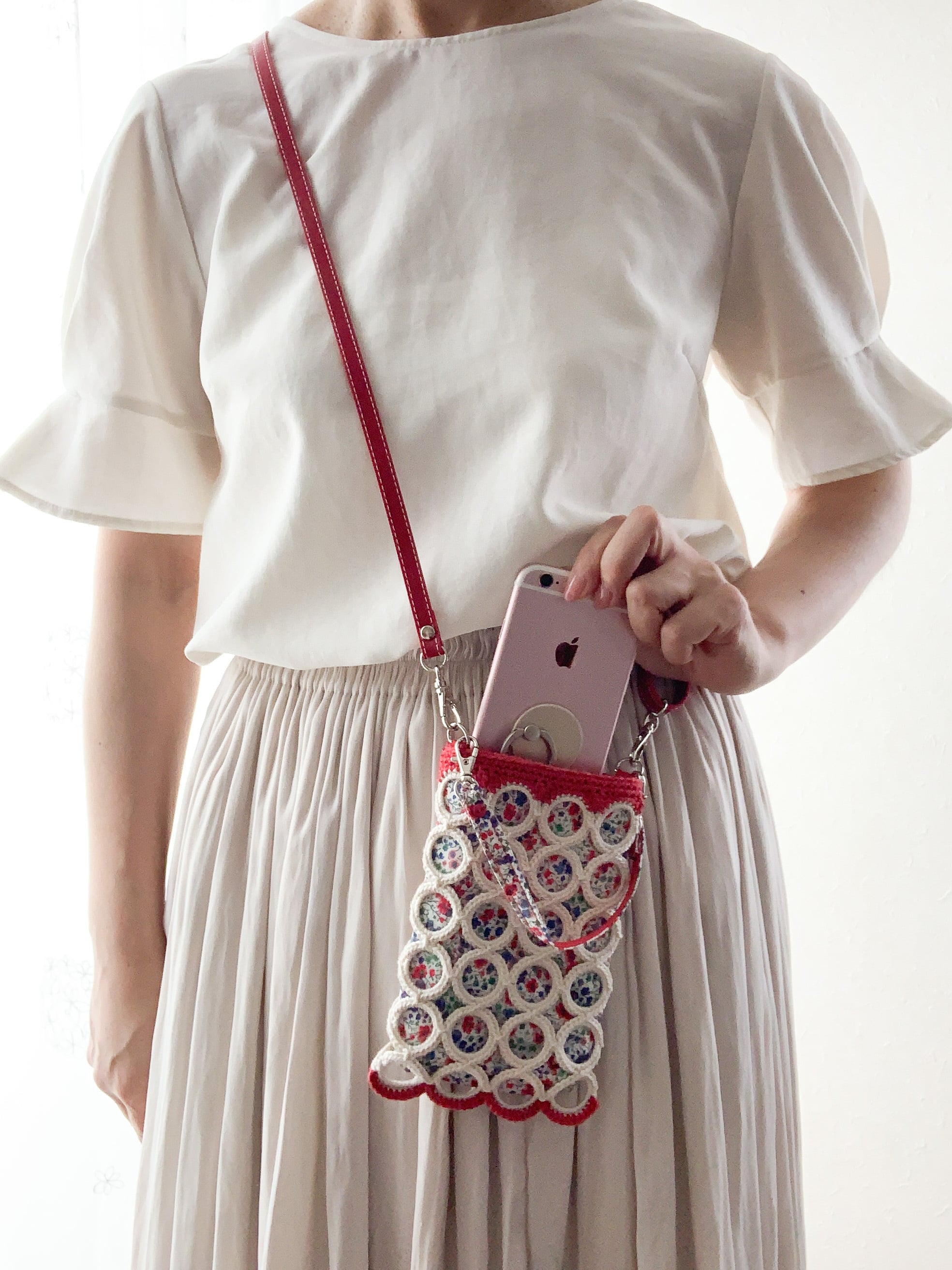 スマホケース赤のみ(リングポシェット)ショルダーベルト付き